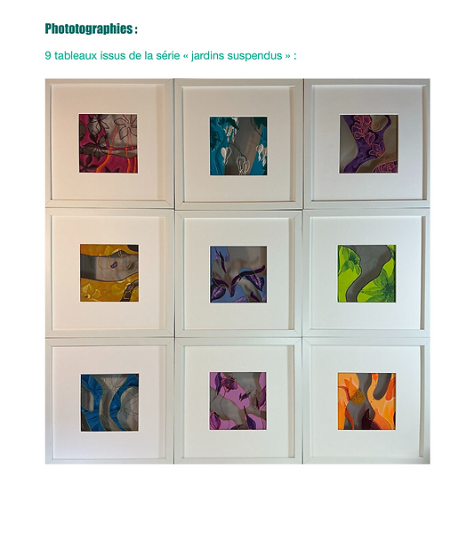 ... La série « jardins suspendus » explore le dialogue entre la peinture et la broderie sur des toiles transparentes. Guidée par mon intérêt pour la flore, j'aime superposer les matières et les motifs pour créer des coins de jardin où la fragilité côtoie la précision. La broderie, par son aspect tactile et méticuleux, vient structurer et ponctuer l'ensemble, invitant le regard à explorer chaque détail.